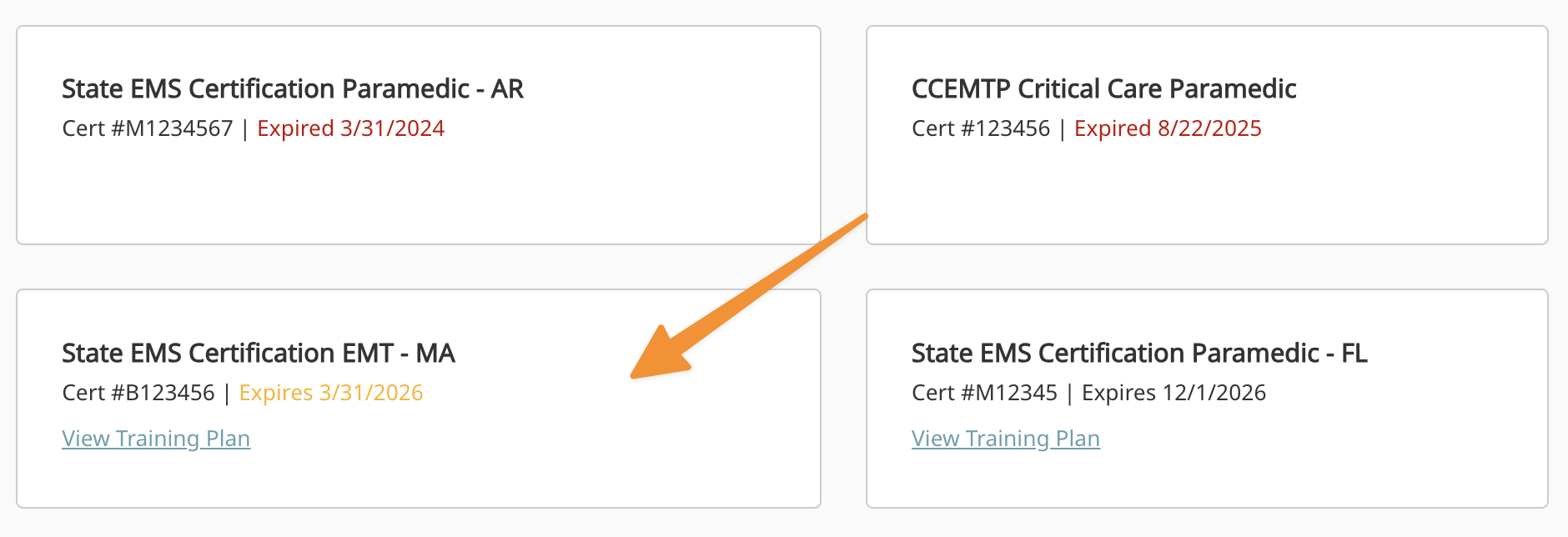 You can add multiple certifications of all types but only an NREMT, State EMS Certification, FP-C, CCP-C, or CCEMTP will generate a training plan.